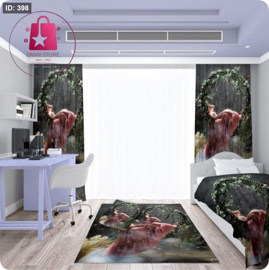 بتكون من : ستارة قطعتين حلقات حديد (ارتفاع 2.6متر *عرض3متر ) * سجادة 90*150 * شرشف مفرد ونص * مخدة* قرنة *