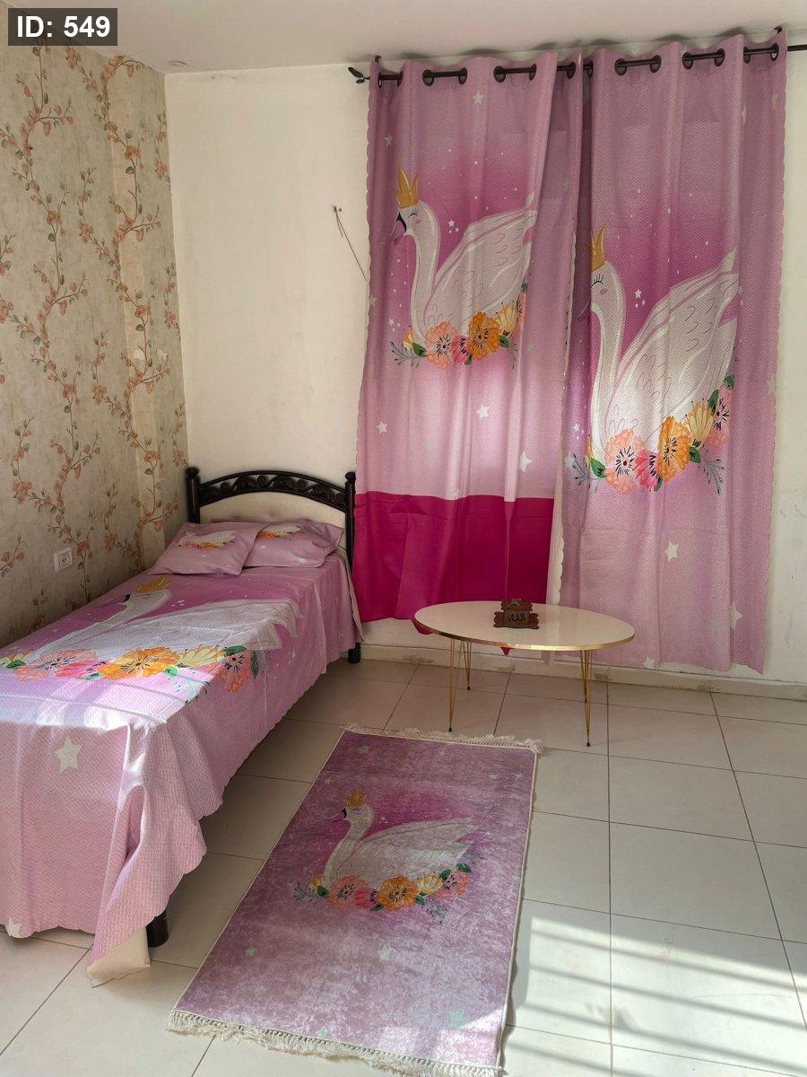 بتكون من : ستارة قطعتين حلقات حديد (ارتفاع 2.6متر *عرض3متر ) * سجادة 90*150 * شرشف مفرد ونص * مخدة* قرنة *