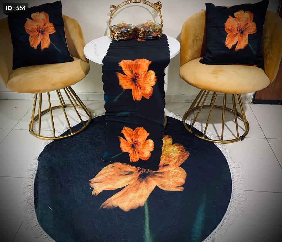 بتتكون من: * سجادة قطرها 90 سم * رنر 140*40 * وجه قرنية عدد 2