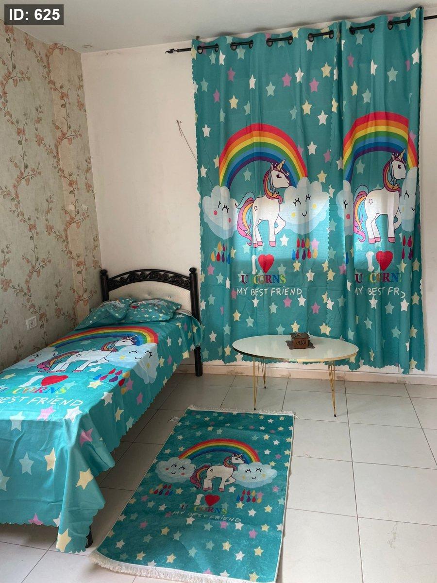 بتكون من : ستارة قطعتين حلقات حديد (ارتفاع 2.6متر *عرض3متر ) * سجادة 90*150 * شرشف مفرد ونص * مخدة* قرنة *